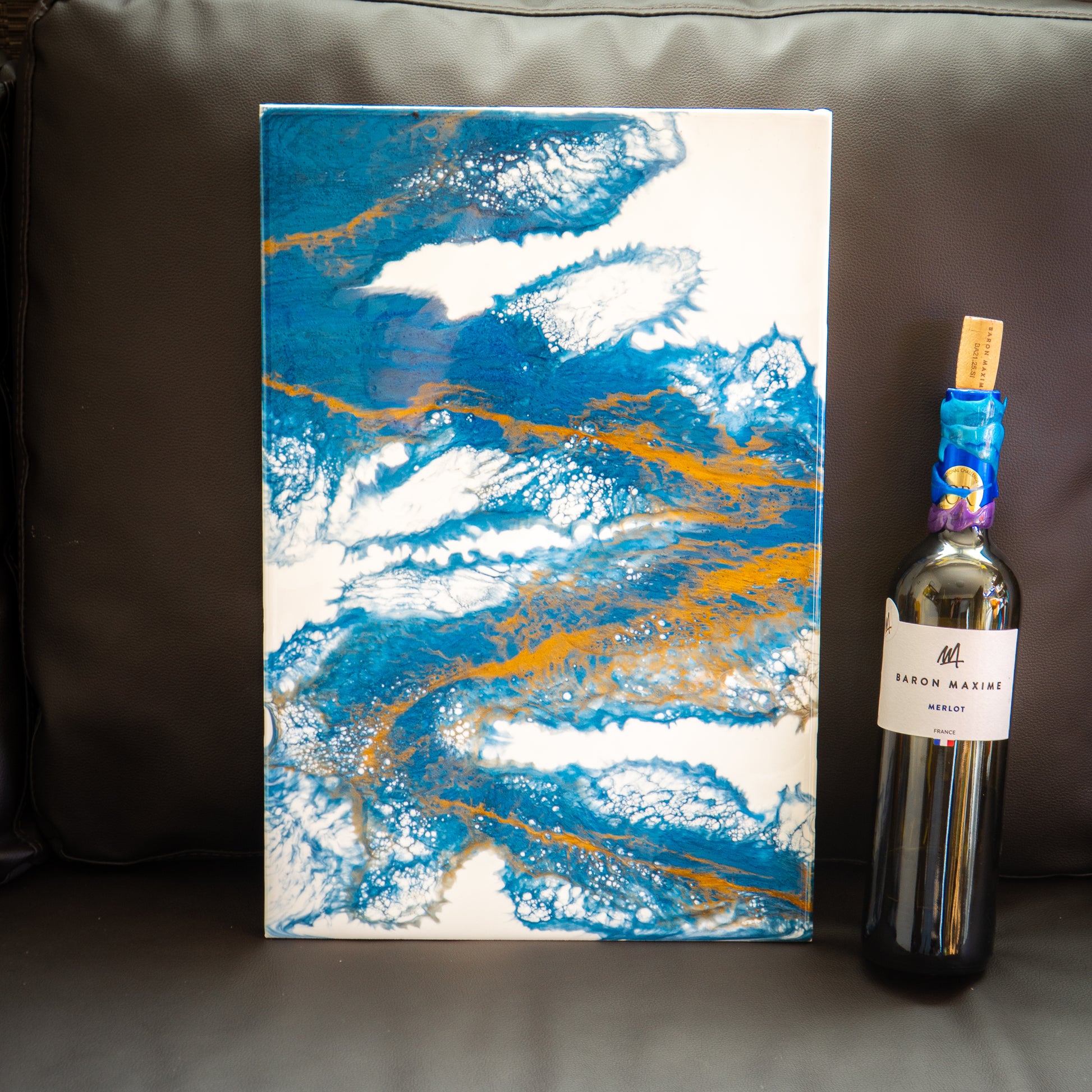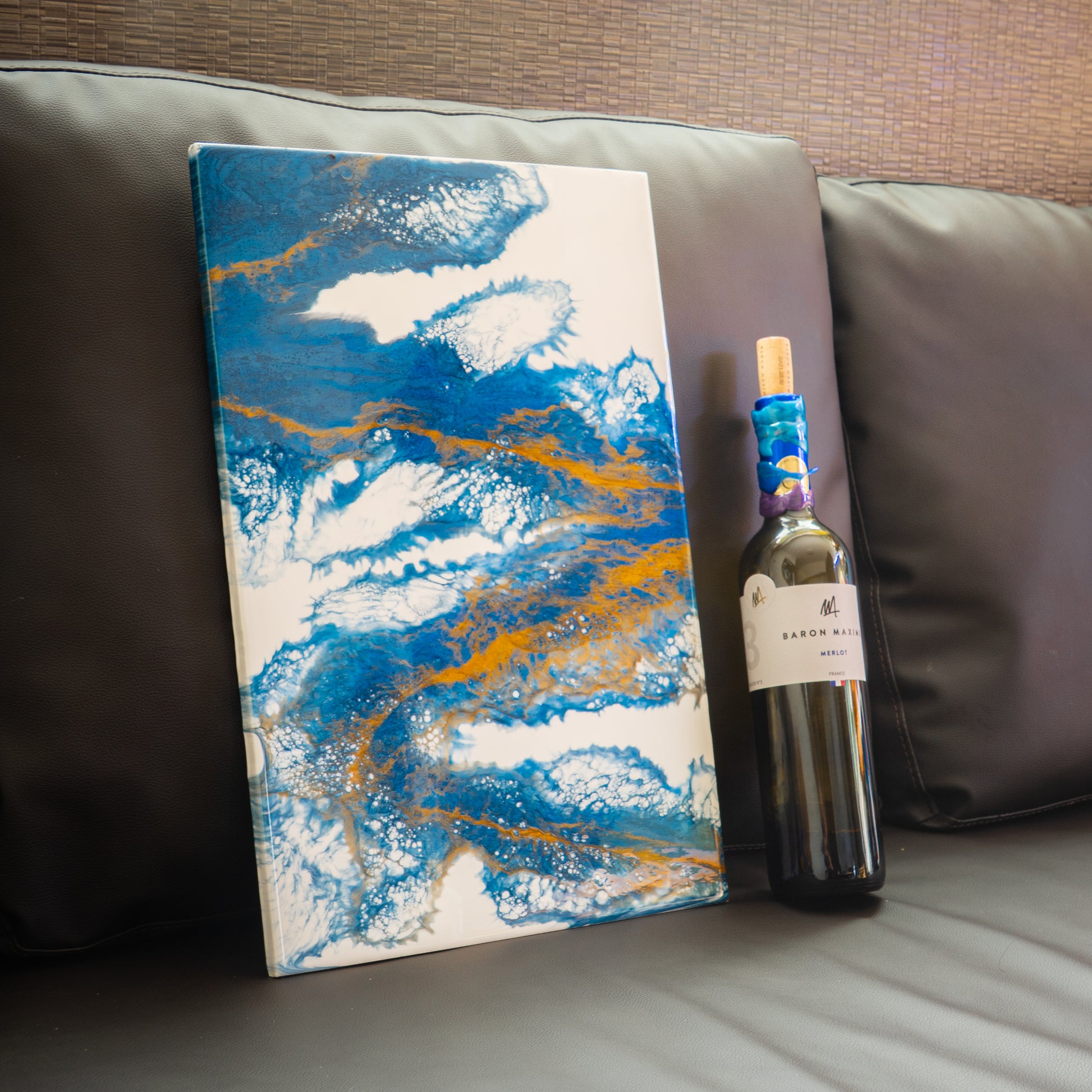 - 素材:ベース:キャンバスパネル/表面:エポキシ樹脂(ホワイト・ブルー)/封入物:ゴールドマイカパウダー