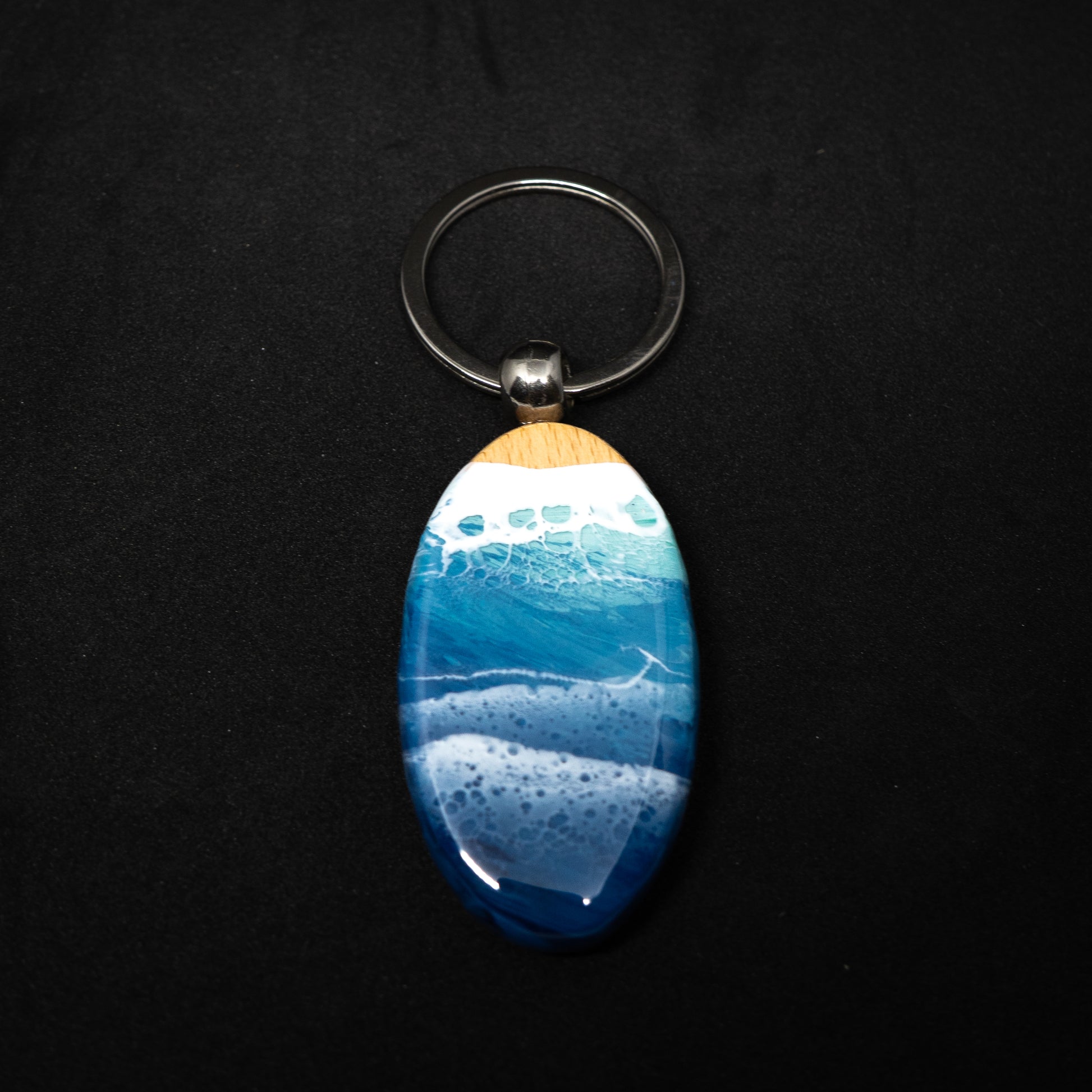 ケヤキの木目とレジンの透明層が、穏やかな潮の満ち引きを思わせる、落ち着いた表情を描き出します。