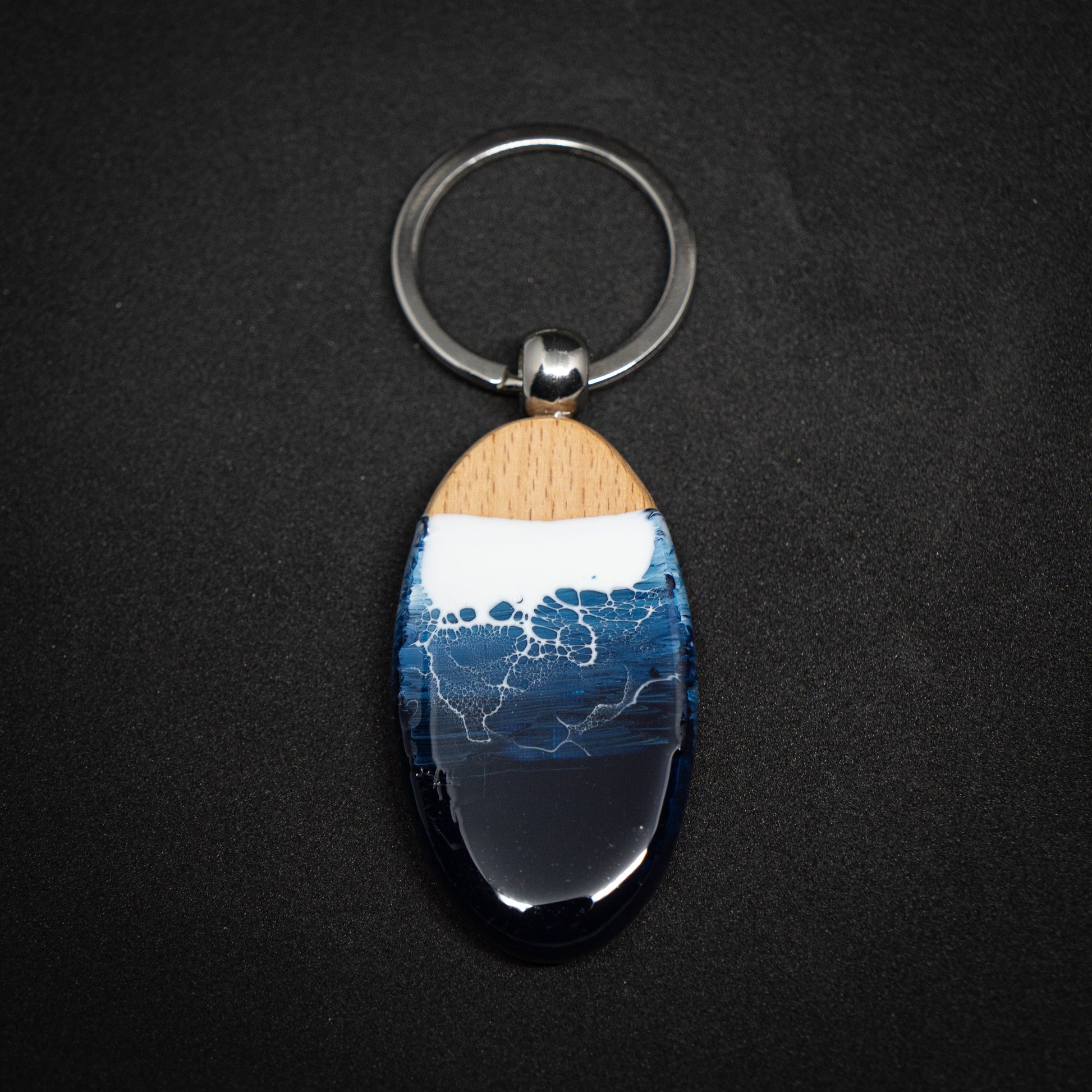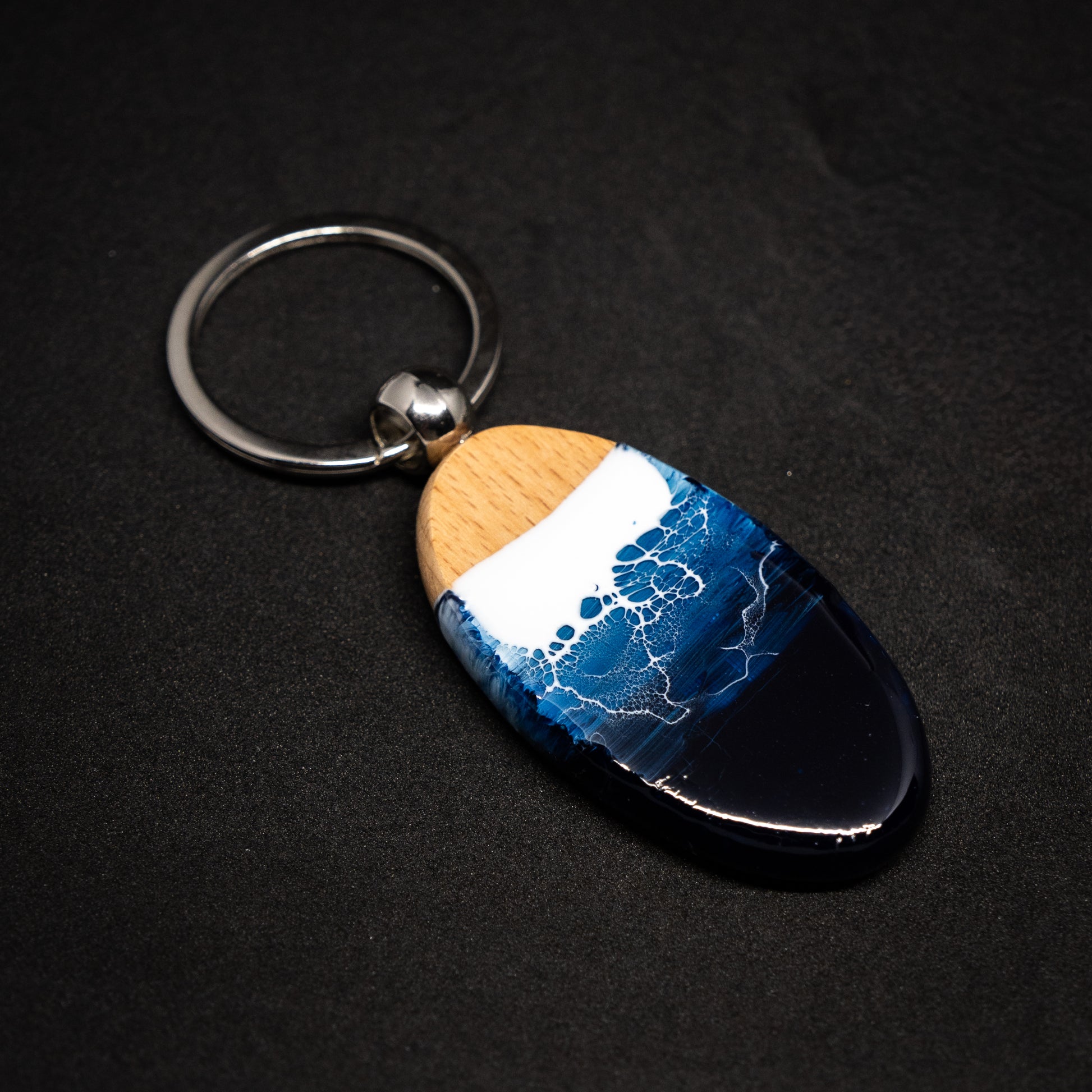 ケヤキの木目と重なるレジンの層が、夜の海が静かに息づくような表情を見せます。